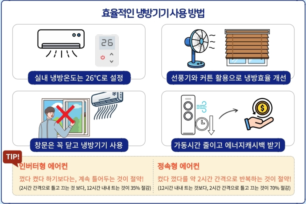 지금 이 글을 읽으신 김에, 우리 집 에어컨이 인버터형인지 확인해보시고, 제습 모드와 냉방 모드를 상황에 따라 적절히 활용해보시는 건 어떨까요? 여기에 한국전력의 캐시백 제도까지 더한다면, 에어컨 전기세로 인한 부담도 한결 덜 수 있을 것입니다.