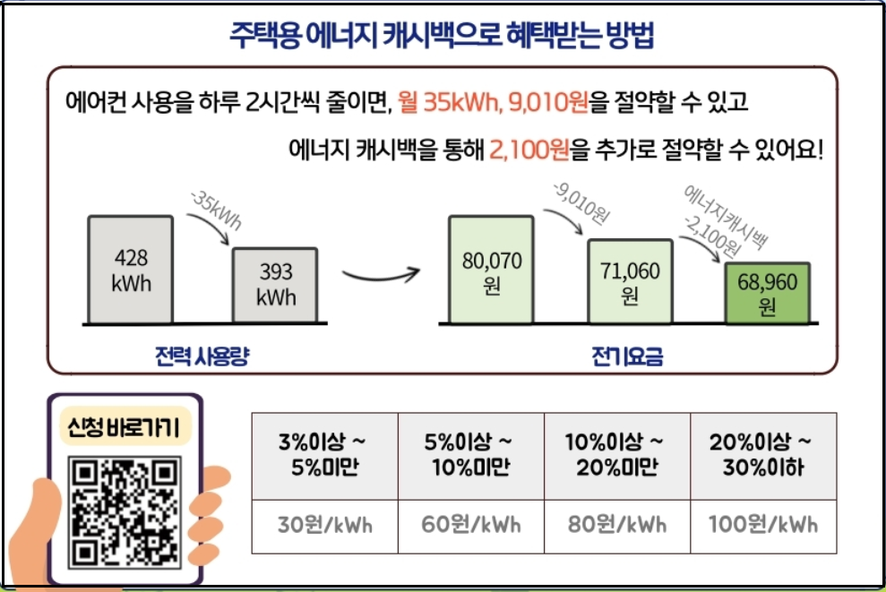 전기요금 절약을 조금 더 체계적으로 하고 싶다면, 한국전력의 ‘주택용 에너지 캐시백’ 제도에 참여해보시는 것도 좋은 방법입니다. 이 제도는 직전 2년 같은 달 대비 3% 이상 전기를 줄였을 경우, 절감한 전력량에 따라 kWh당 최대 100원의 캐시백을 받을 수 있는 프로그램입니다.