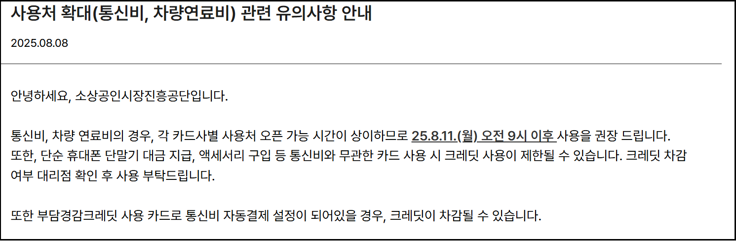 통신비 확대는 소상공인이 매월 지출하는 전화·인터넷·모바일 통신료 부담을 줄이고, 차량 연료비 확대는 영업 및 물류 활동을 하는 소상공인의 비용 절감을 돕는 효과가 기대됩니다.