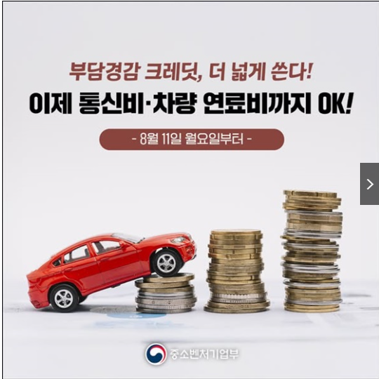 중소벤처기업부는 소상공인의 고정비용 부담을 덜어주는 ‘부담경감 크레딧’ 사업의 사용처를 기존 공과금 납부 중심에서 통신비와 차량 연료비까지 확대한다고 밝혔습니다.