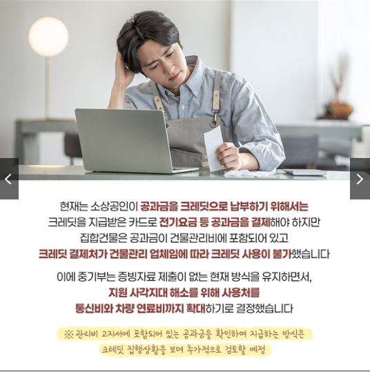기존에는 전기, 가스, 수도요금과 국민연금, 건강보험, 고용보험, 산재보험 등 총 7개 항목에서만 사용이 가능했습니다. 하지만 일부 소상공인은 공과금이 건물관리비에 포함되어 있어 카드 결제가 건물관리업체를 통해 이루어지다 보니 크레딧 사용이 불가능하다는 불편을 호소해왔습니다.