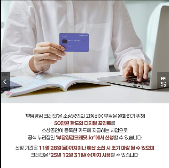 '부담경감 크레딧’은 소상공인의 고정비용 경감을 위해 최대 50만 원 한도의 디지털 포인트를 지급하는 사업입니다.