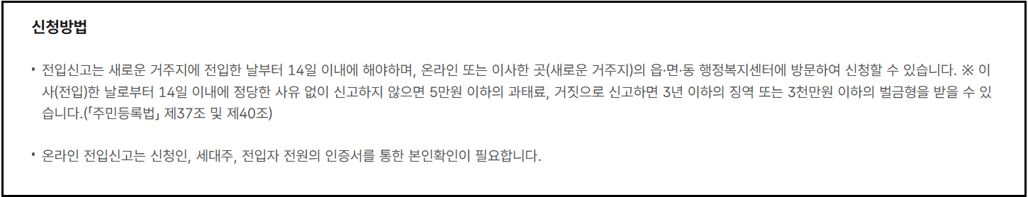 바쁘고 복잡한 이사 과정 속에서도 전입신고를 놓치지 말고, 인터넷을 통해 빠르고 편리하게 처리하시길 권장드립니다.