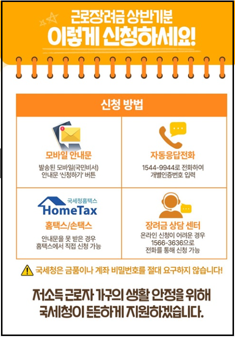 - 안내문을 받지 못한 경우에는 국세청 홈택스(PC) 또는 손택스(모바일 앱)에 로그인해 근로장려금 신청 메뉴를 통해 직접 신청할 수 있습니다.