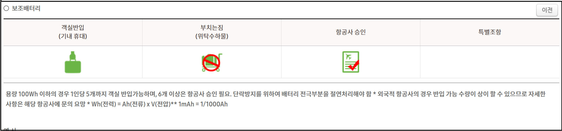| 160Wh 초과 | 반입 불가 | - | 캠핑용 초대형 배터리 등은 반입 금지. |
