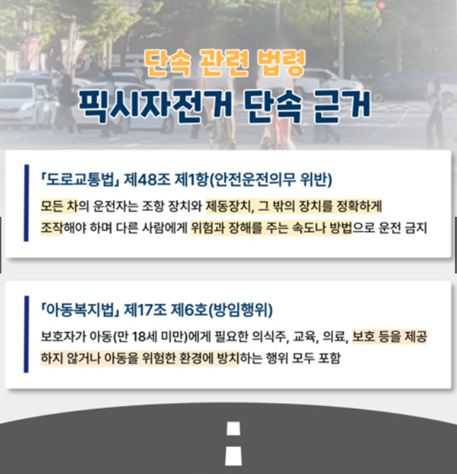 - 현재 자전거 관련 법령에는 ‘브레이크 유무’에 대한 규정이 명확하지 않아 단속에 한계가 있습니다. 이에 따라 정부는 자전거법 개정을 추진 중입니다.