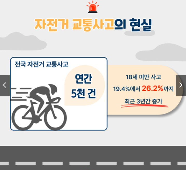 자전거 교통사고는 매년 5천 건 이상 발생하고 있습니다. 특히 최근 3년 동안 청소년(18세 미만)의 사고 비율이 19.4%에서 26.2%로 급격히 증가하며 사회적 문제로 떠올랐습니다.