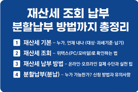 이 글에서는 재산세의 과세 시기와 납세의무자, 위택스(온라인)로 조회·영수증 발급하는 방법, 실제 납부 수단(인터넷·은행·ARS 등)과 분할납부(분납) 신청 조건·절차·유의사항까지 쉽고 실전적으로 정리해 드립니다.