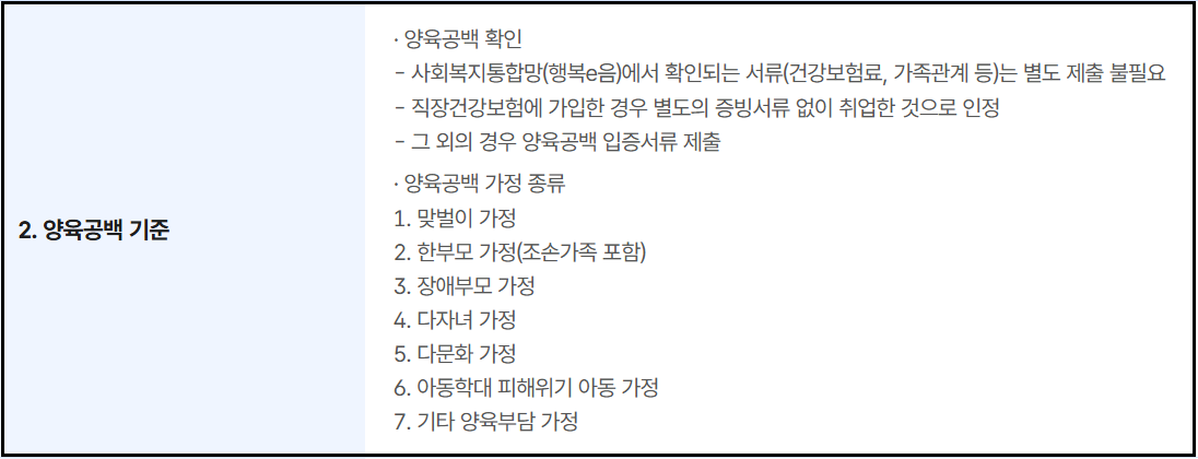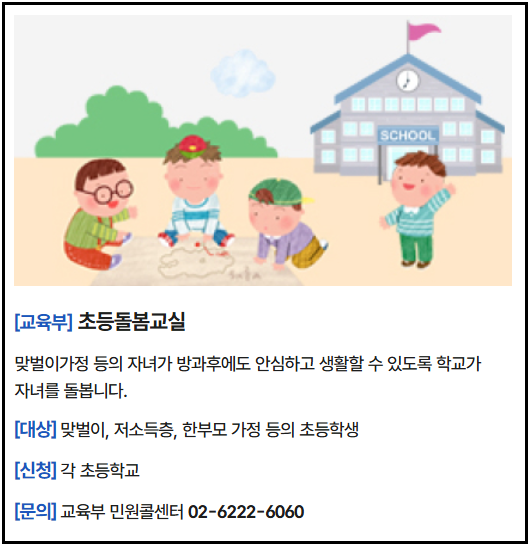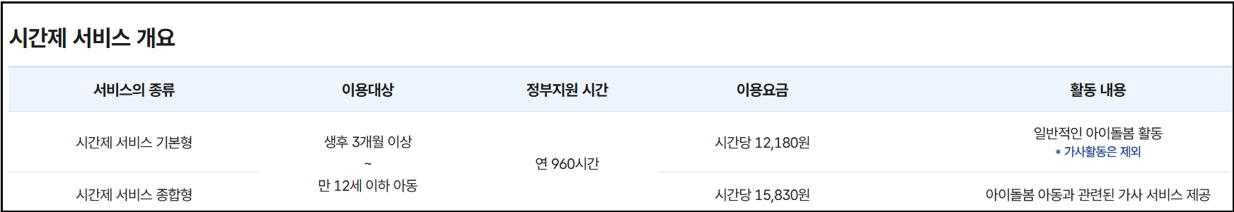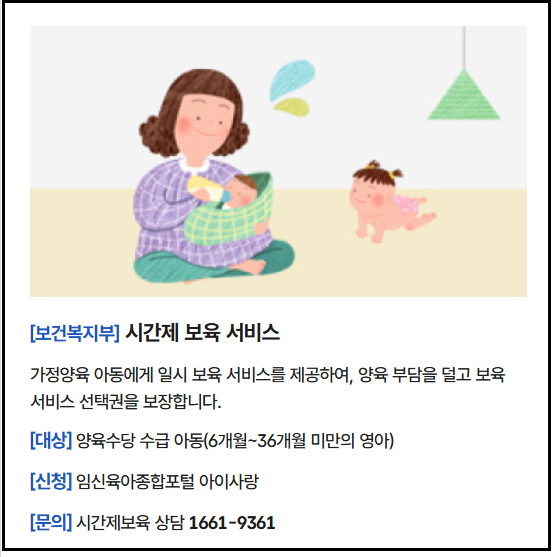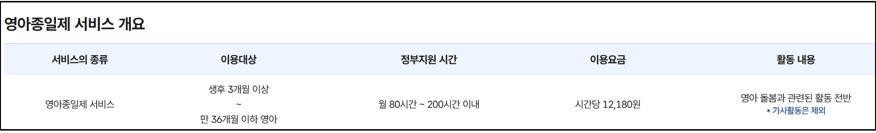 - 유형: 영아종일제, 시간제 돌봄, 질병감염 아동 지원 등