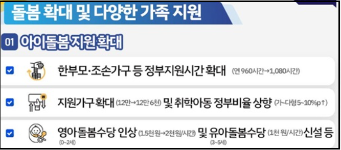 - 한부모·조손가구 지원시간 확대: 연 960시간 → 1,080시간