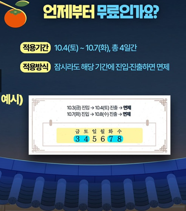 반대로 10월 7일 화요일에 진입해 10월 8일 수요일에 빠져나오는 경우에도 면제가 적용됩니다.