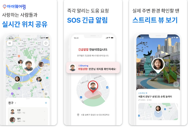 - 아이셰어링은 가족이나 친구끼리 실시간 위치를 공유하고, 특정 구역을 벗어나면 알림을 받을 수 있는 기능이 특징입니다.