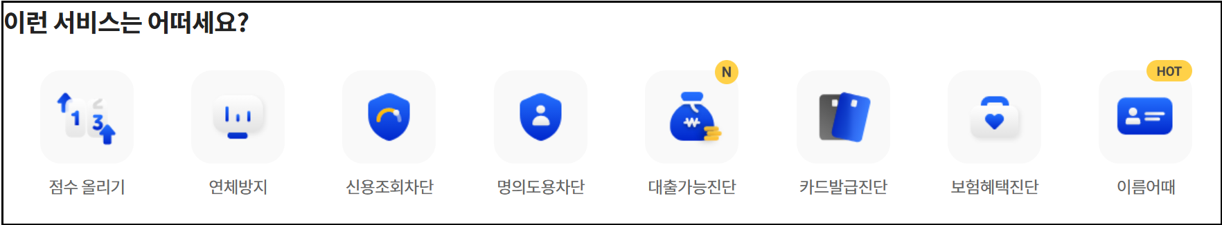 | 신용리포트 | 카드, 연체정보 등 종합 분석 보고서 제공 |