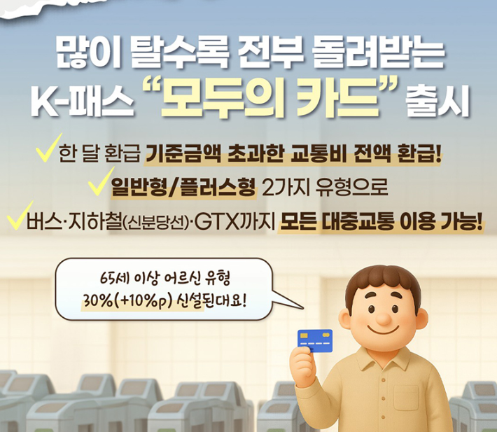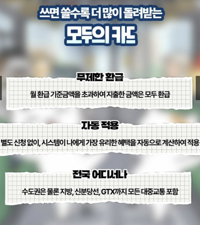 특히 새롭게 도입되는 ‘모두의 카드’는 일정 기준을 넘는 교통비를 전액 환급해 주는 구조로, 많이 이용할수록 혜택이 커지는 것이 특징입니다.