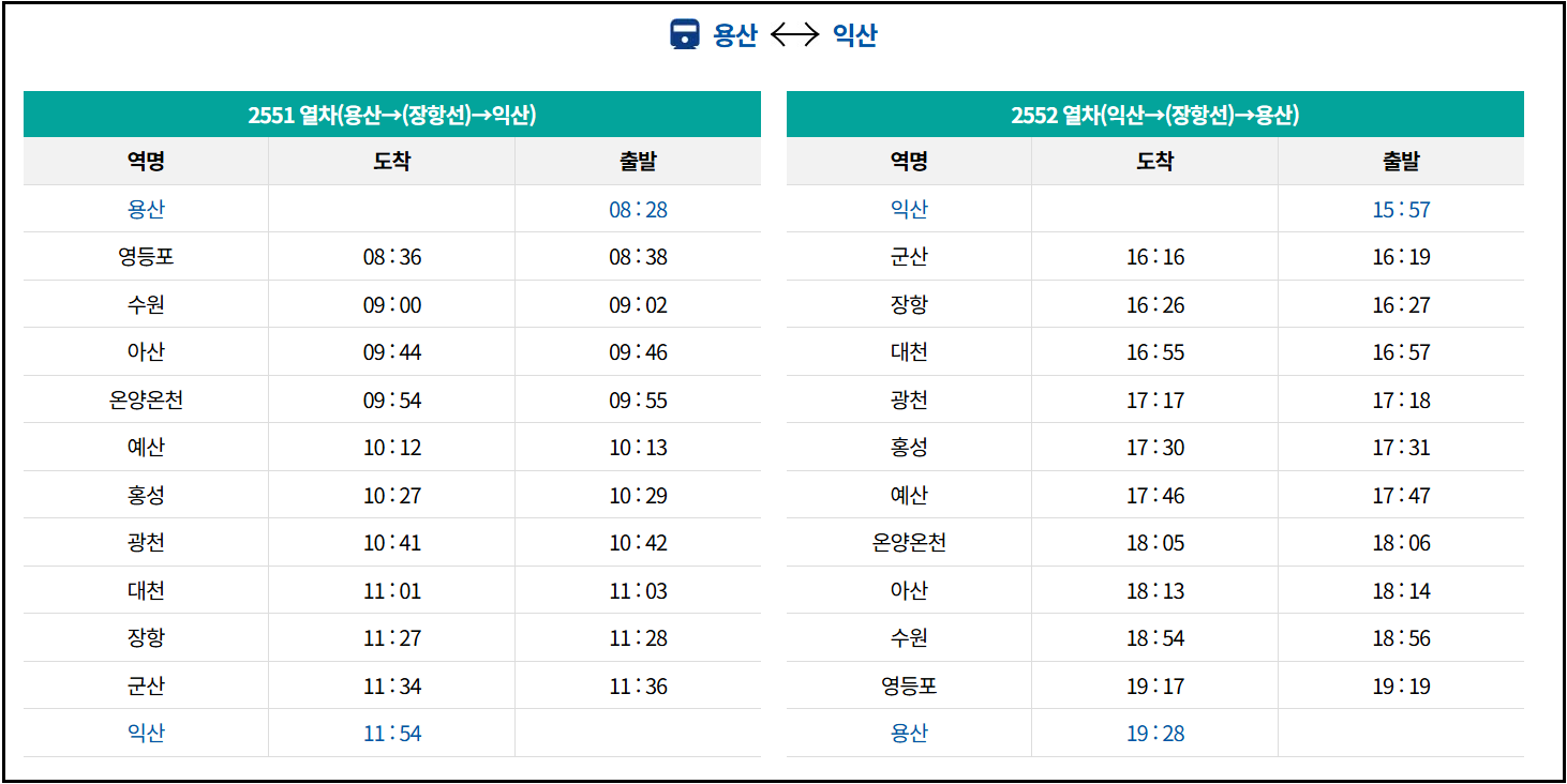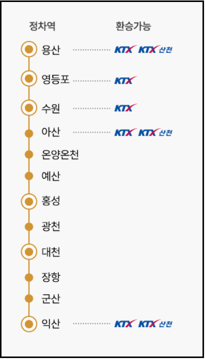 용산 → 영등포 → 수원 → 아산 → 온양온천 → 예산 → 홍성 → 광천 → 대천 → 장항 → 군산 → 익산