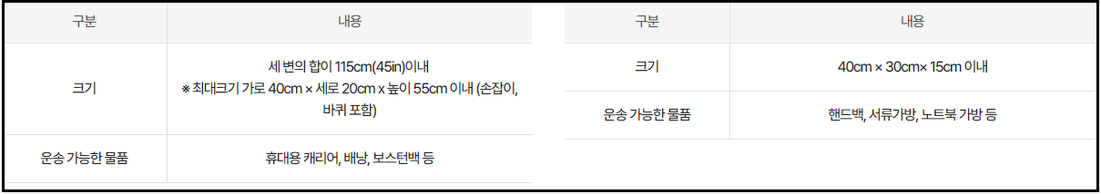 - 크기와 무게 제한이 다르며, 사전 신청이 필요한 경우도 있습니다.
