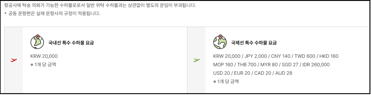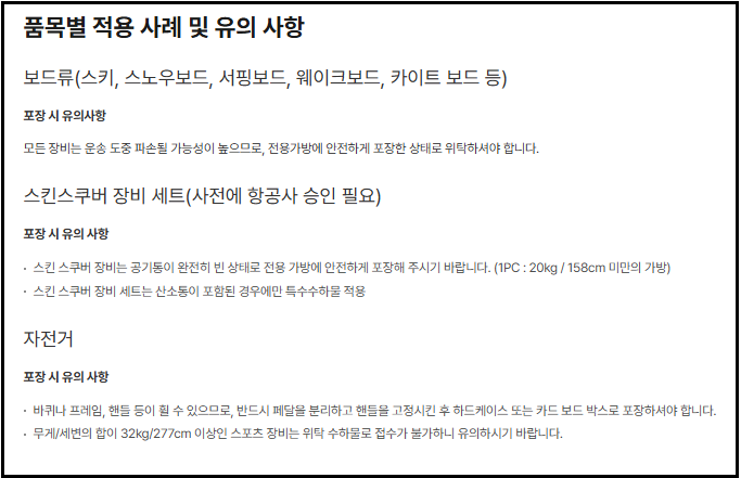 - 특수 수화물은 별도 기준 적용