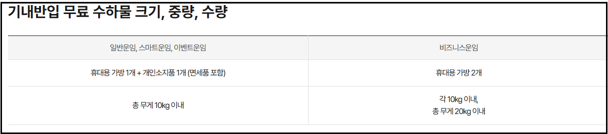 - 기내 수화물: 10kg / 115cm 이내