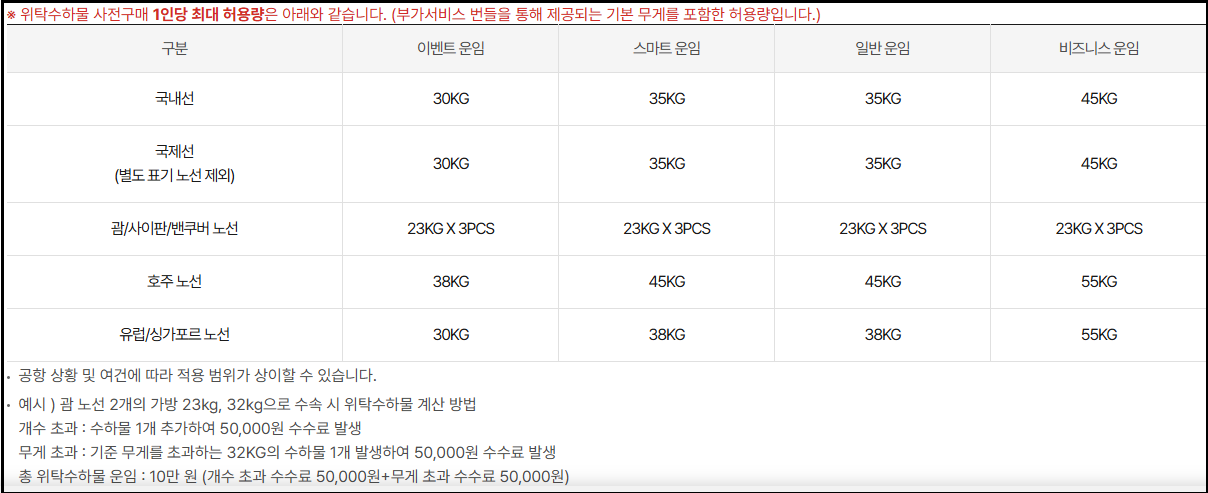 또한 일부 경우에 한해 동반자 간 수화물 무게 합산이 허용되기도 하지만, 모든 항공권에 적용되는 것은 아니므로 현장 확인이 필요합니다.