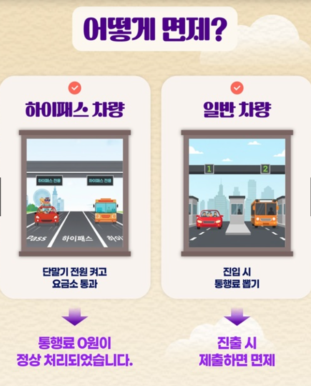 👉 즉, 진입·진출 시점 중 하나라도 면제 기간에 포함되면 통행료가 면제됩니다.
