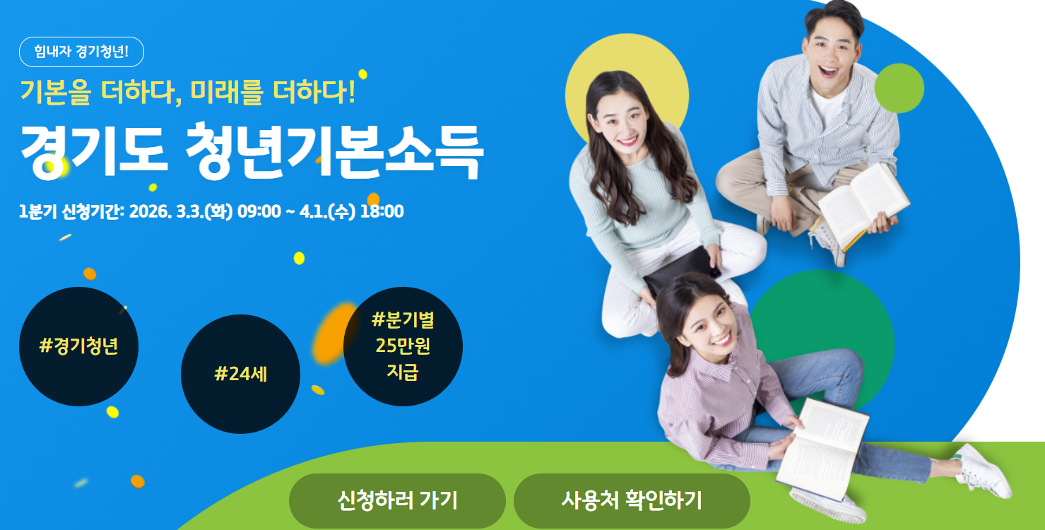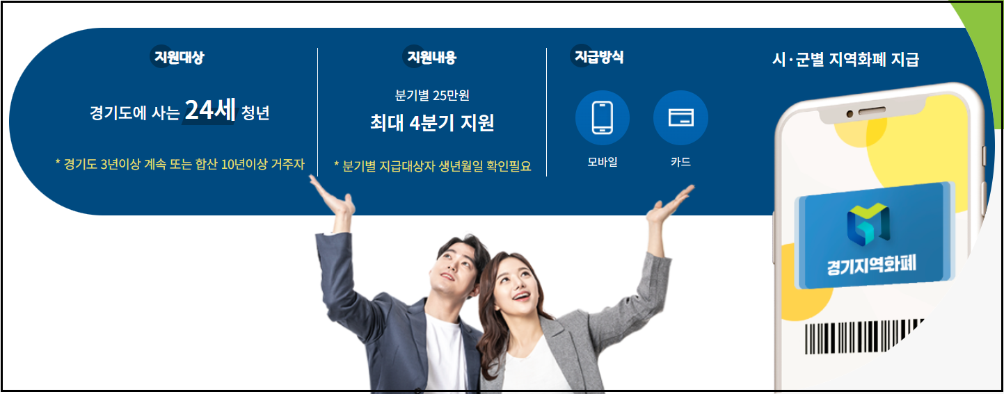 경기도에 거주하는 만 24세 청년이라면 분기별 25만 원, 연 최대 100만 원을 받을 수 있는 제도가 있습니다. 바로 경기도 청년기본소득인데요.