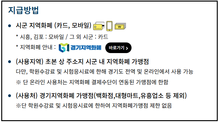 특히 학원 수강료나 시험 응시료는 경기도 전역에서 사용 가능한 경우도 있습니다.